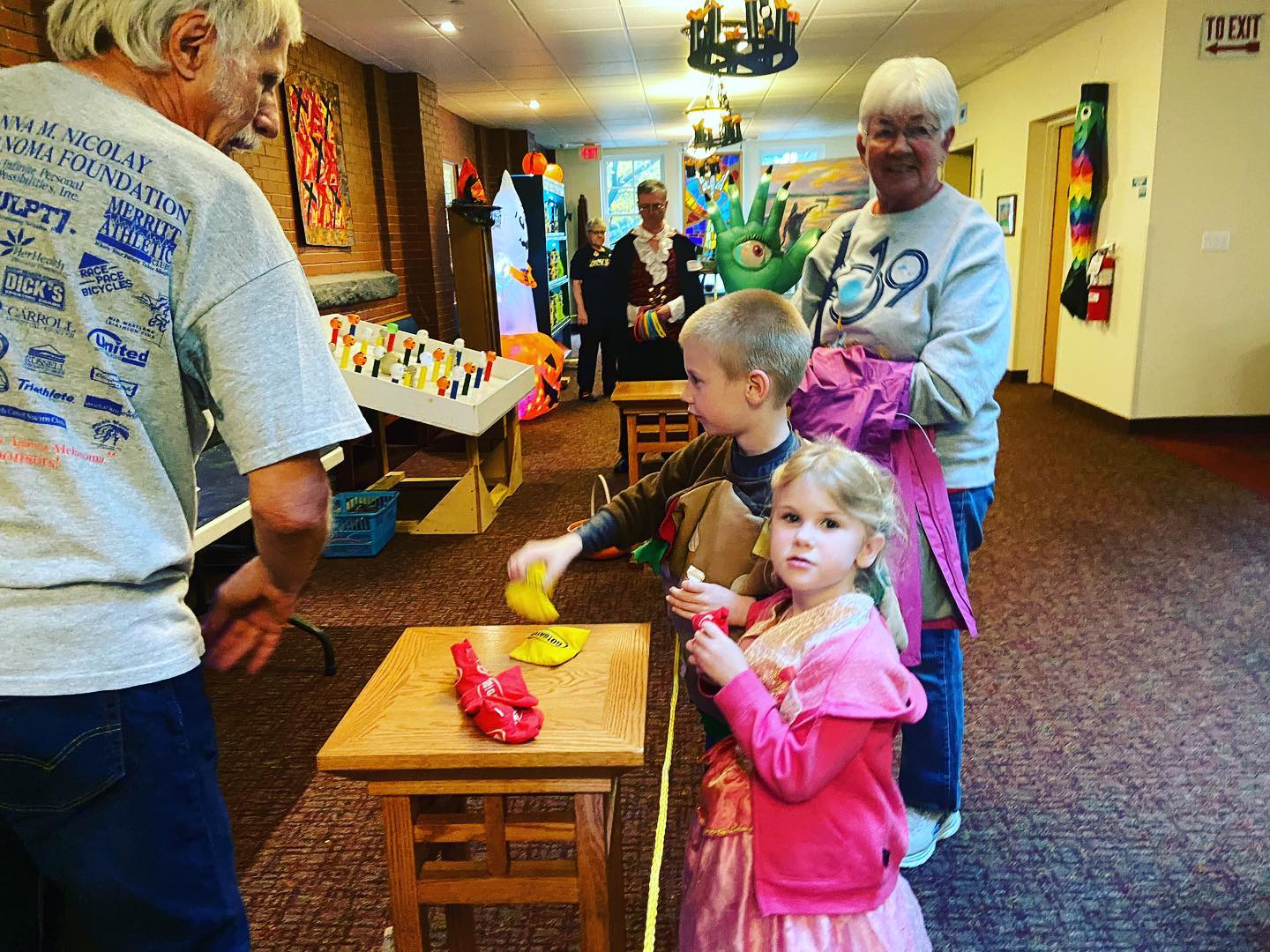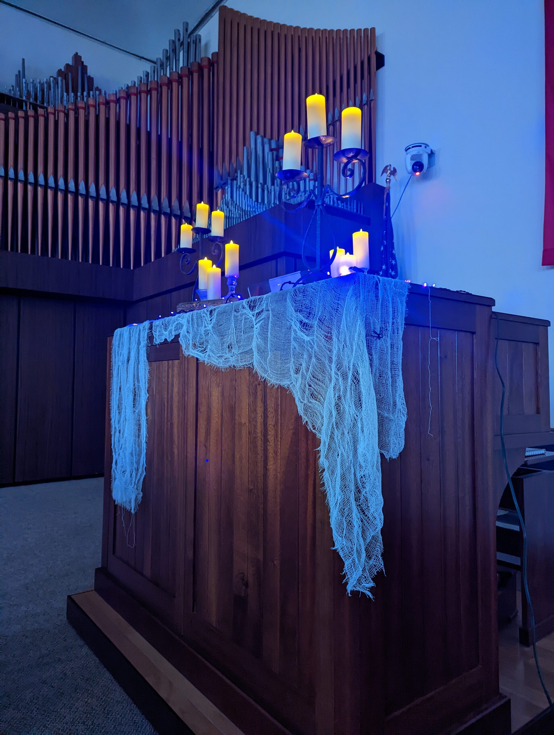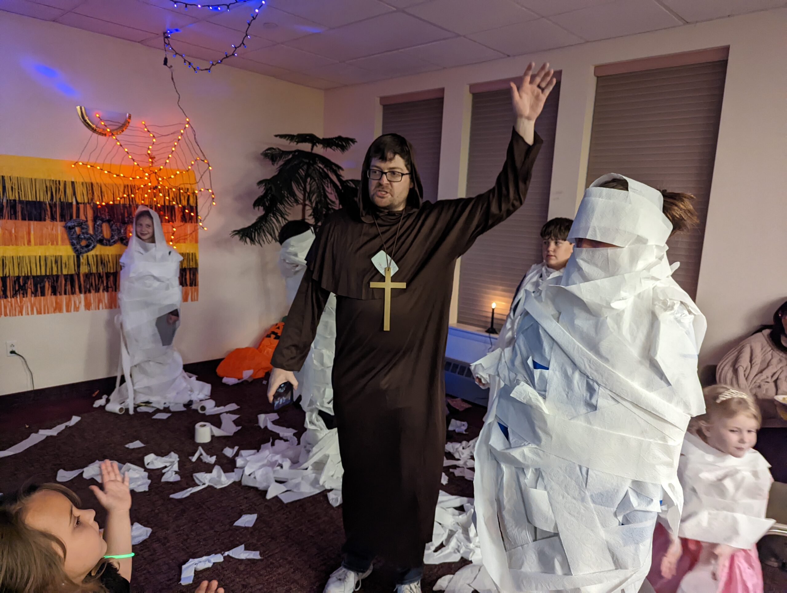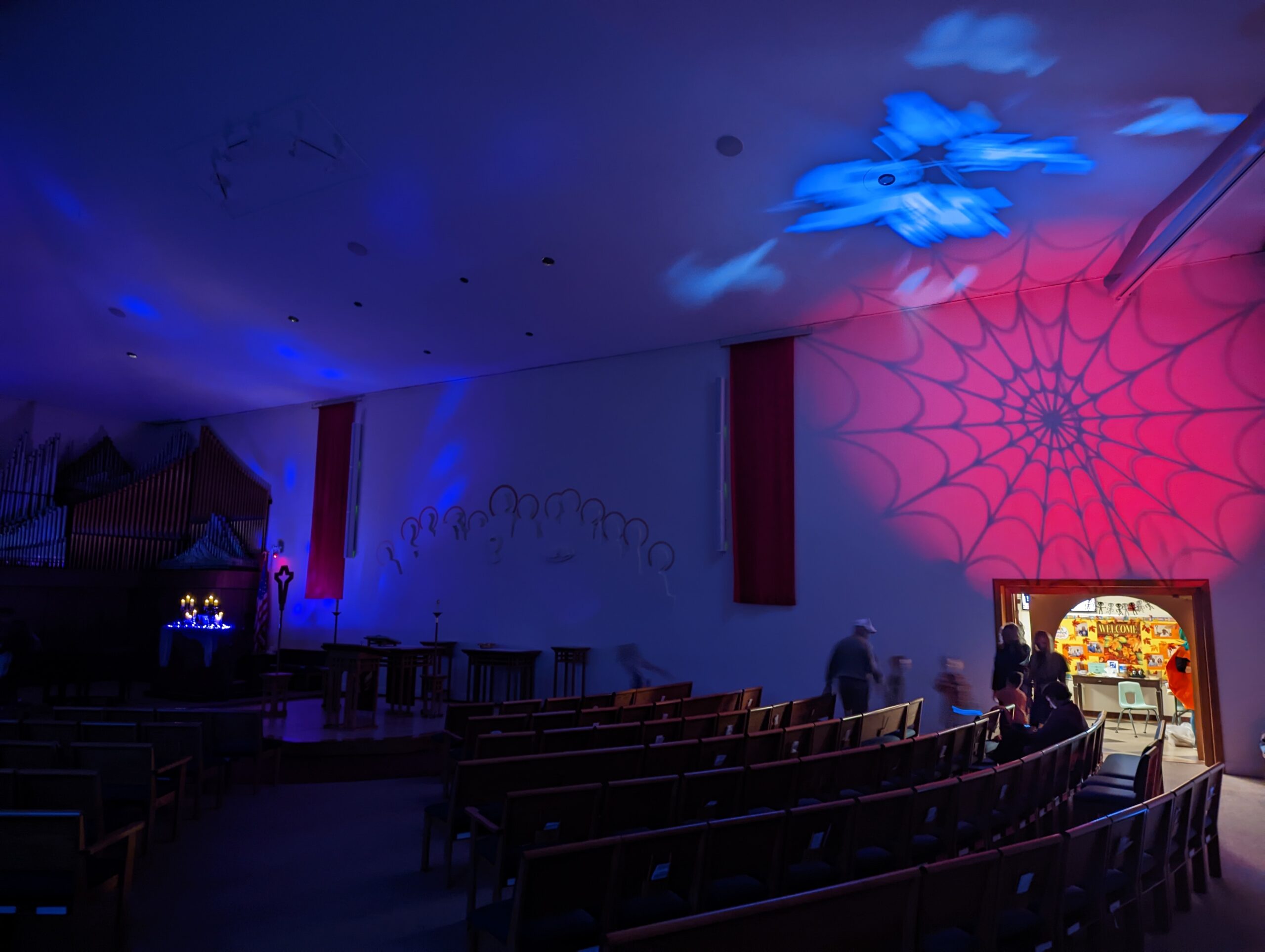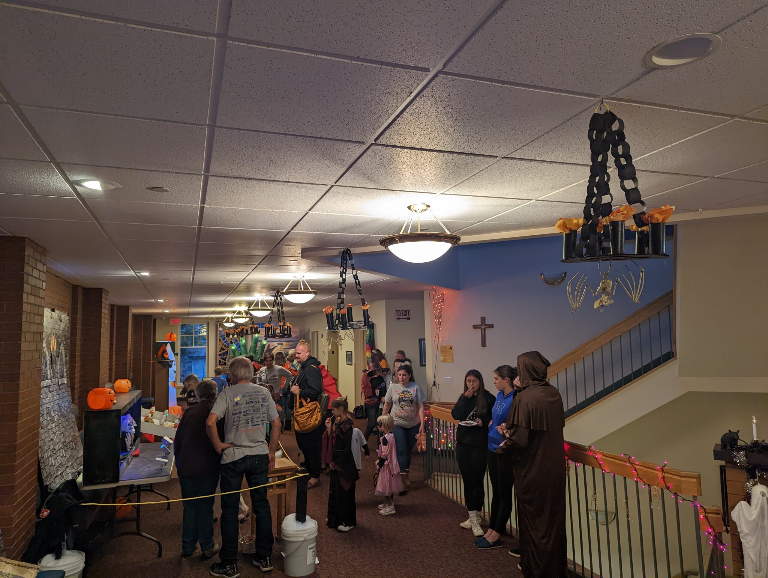 We decorate our gathering area and worship space for some unearthly fun. We have carnival games to play. Our Youth Minister, Adam Michael organizes great games and activities for the youth. And we have a few snacks on hand in case anyone gets the munchies. We dim the lights in our worship space, and our Minister of Music, Jonathan Noel, plays eerie (but fun!) music on our organ. It really is a great evening for the whole family!